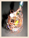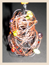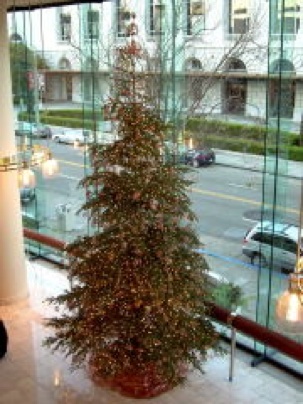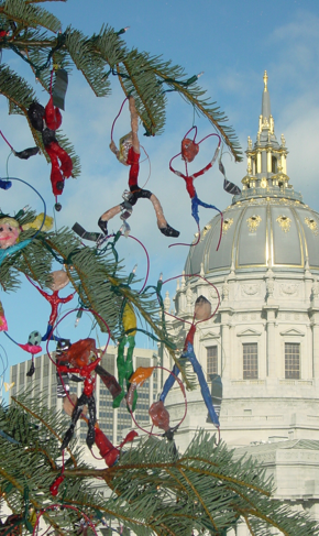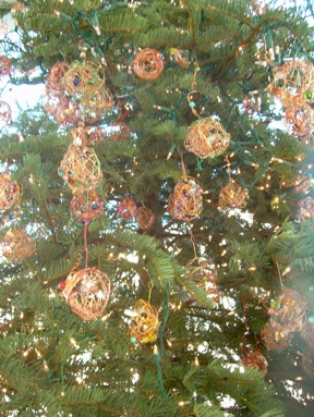 The beautiful looped wire sculpture of Ruth Asawa, seen in the deYoung retrospective, provided the inspiration for this year’s tree. The transparent forms of the ornaments were shaped by wrapping balls of ice, which was then melted away after the forms were woven in wire.