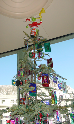 Lunatique Fantastique’s “Reframing the Hourglass,” a puppetry performance chronicling the relationship of two friends, was the inspiration for the 2004 tree. The ornaments were made of foil, wire and decoupaged tissue.