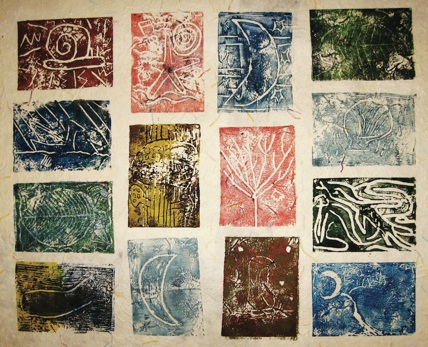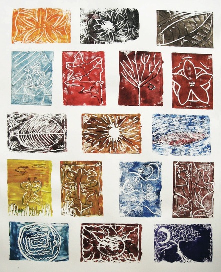 Assemblage of linocuts of trees, leaves or scenes from nature printed by these talented 5th graders in lush colors on a handmade paper, elegantly matted and framed.