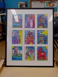 Framed watercolor and pen art pieces comprised of individual fantasy Victorians drawn in ink and watercolored by each child in Room 105.