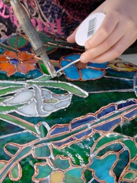 Ms. Worrell’s budding artists tried their hand at Cubist “Picasso” self portraits. They transferred their line drawings on silk and painted in bright primary colors, using the French “Serti” method.