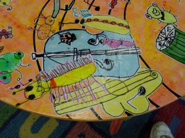 Room 3 Kindergartners created this beautiful bright, decoupaged table with 2 chairs, inspired by jazz music. 4’ Diameter round table with 2 small chairs.