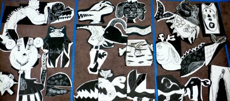 This piece is made of imaginary creatures cut and pieced together. Using black charcoal on white paper and white chalk on black paper. It was inspired by Picasso's Guernica. The power of light and dark graphically to influence the piece. The children worked with partners. The idea was to learn to collaborate, improvise and inspire each other like a Jazz ensemble. We talked about how to put the work together, shifting images and dimensions. The size of the piece(s) is approximately 50"x 105".