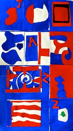 Vaughn's 1st Grade class studied Matisse cutouts. We talked about shape and line, jagged and curved, thin and thick and the different feelings achieved. We talked about the colors Matisse used and what feelings they inspired in the children: calm, joyful, angry, excited etc. We talked about color relationships and how colors change next to each other. Finally we talked about space, how to place the individual paper and how placement changed the impression of the whole piece. The children spent time cutting and moving pieces around, choosing colors, changing colors. The final pieces are cut outs from painted paper, glued onto backgrounds, inspired by the Jazz music they listened to as they worked. The size of the pieces is approximately 20"x42" and 22"x30" framed with white matting and black wood frame.