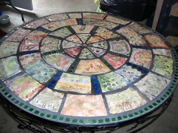 An elegant wrought iron garden table transformed with a tabletop inlaid with beautifully glazed ceramic tiles, each impressed with a linocut image drawn by one of these talented 5th graders. Each tile features a personal interpretation of an image from nature ranging from fall leaves and fruit to sea shells and creatures! Dimensions approximately 24 x 44 x 24 inches