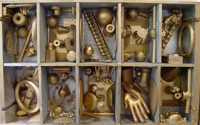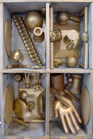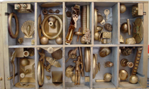 A pair of Shadow Boxes, inspired by the artwork of Louise Nevelson, subdivided into individual cubby holes, each of which has been transformed by a personal assemblage of everyday objects, specifically selected by each child from home, the classroom or found in nature. Each assemblage has an elegant gold leaf finish to memorialize the creativity of these creative 1st graders. Dimensions of each shadow box is approximately 5” x 30” x 20” inches.